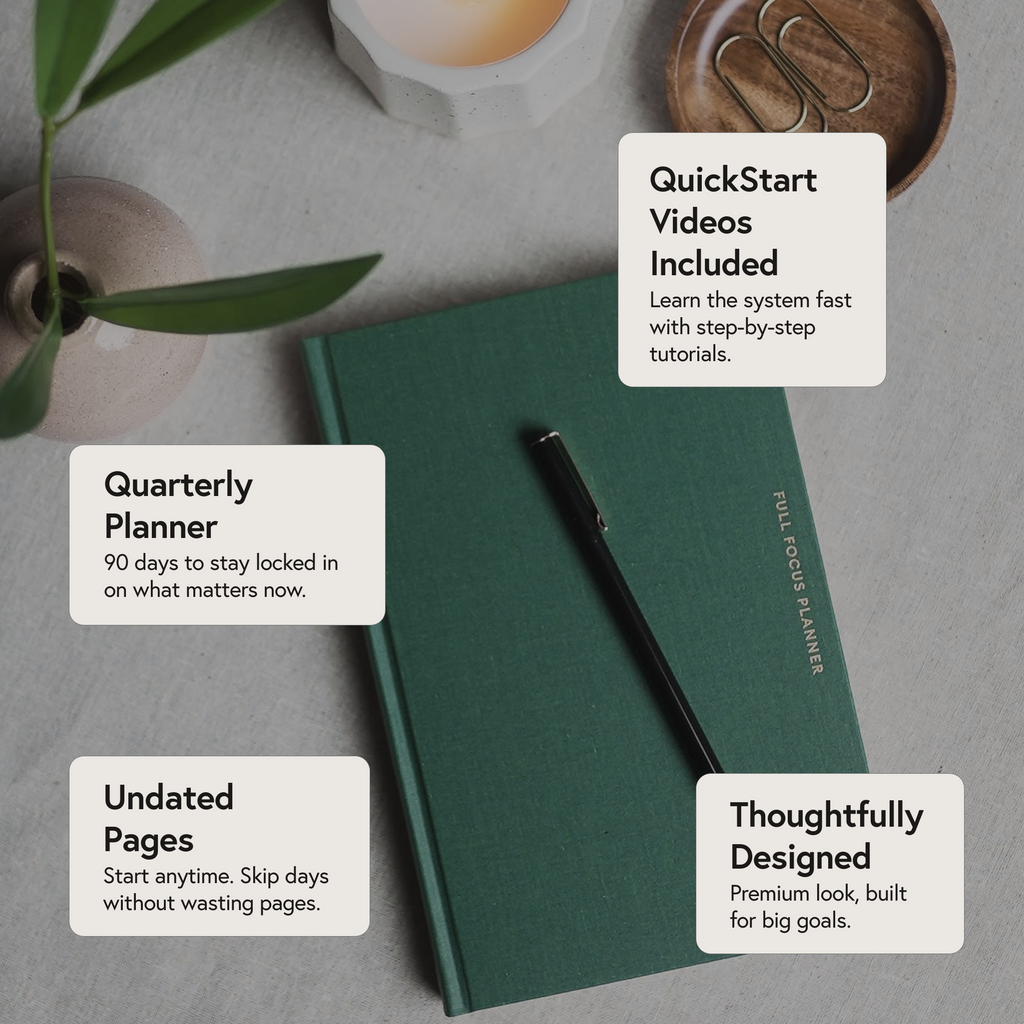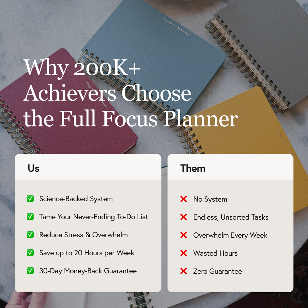 Great question. Other planners simply list tasks. Sure, it feels good to check them off—but are you completing the right tasks that move you forward? The Full Focus Planner ties your daily tasks directly to your long-term goals. It's designed not just to organize and record your tasks, but to make sure you get the RIGHT work done that leads to completed goals every year—like clockwork. The cost reflects its unique structure: breaking the year into four quarters for laser-focused goal achievement.