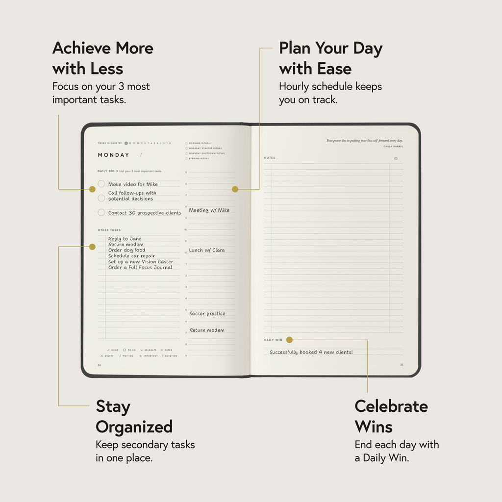 The main differentiator between the Full Focus Planner and other planners is the Full Focus System it’s based on. The Full Focus Planner is built on a science-based goal-achievement system that focuses you on the work that matters for achieving your most important goals. There is an iron-thread connecting your goals down to your daily tasks, ensuring you make progress day-in, day-out, and finally knocking out your biggest and most elusive goals.