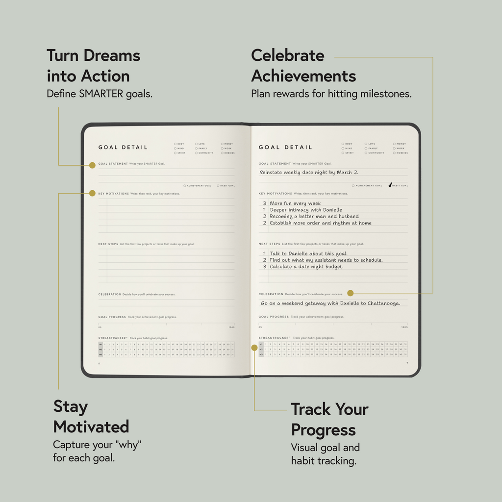 Designed for high achievers, the linen Full Focus Planner blends a proven goal-setting system with a tactile, cloth-coated cover that feels as good as it looks. Built on the Full Focus System—trusted by over 200,000 users—it helps you accomplish more in less time, while supporting every area of your life through Life Domains, Self-Care Planning, and Daily Rituals.