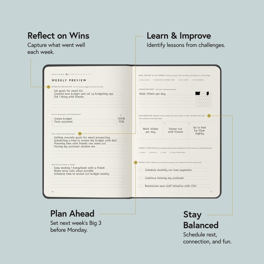 The power of the Full Focus Planner is its simplicity. At its core, the Full Focus Planner can be boiled down to three steps: (1) Set your annual/quarterly goals; (2) Determine your 3 biggest goals at the beginning of each week; (3) Set your 3 most important Daily Tasks that accomplish your weekly goals. There are more tools if you want them, but if you just did those three things, you’d become one of the most prolific goal-achievers you know.